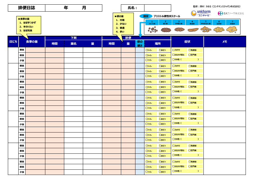 そのような時にそれぞれの人にちょうどいい下剤の使い方を見つけていくためには、排便日誌を用います。